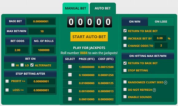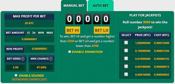 Con las apuestas manuales tenemos la posibilidad de seleccionar y modificar todos los parámetros disponibles en cada tirada. Si os fijáis en la imagen anterior, os daréis cuenta que en la parte central hay cinco dígitos que pueden variar de los números 0 a 10.000 (igual que en la sección FREE BTC).